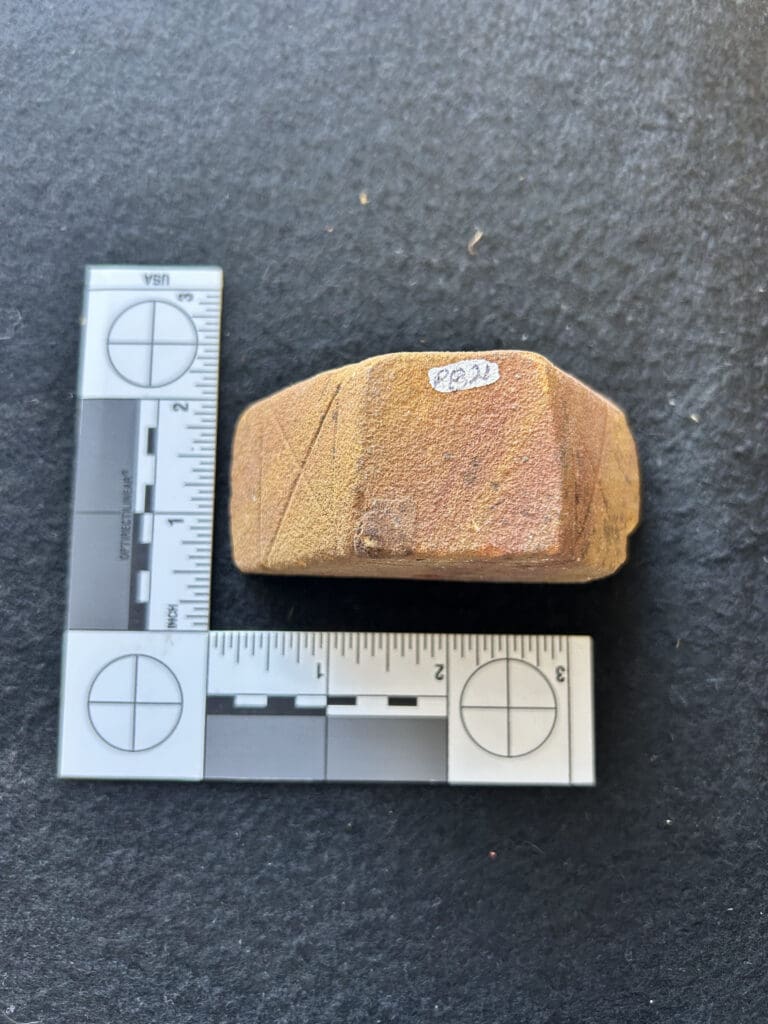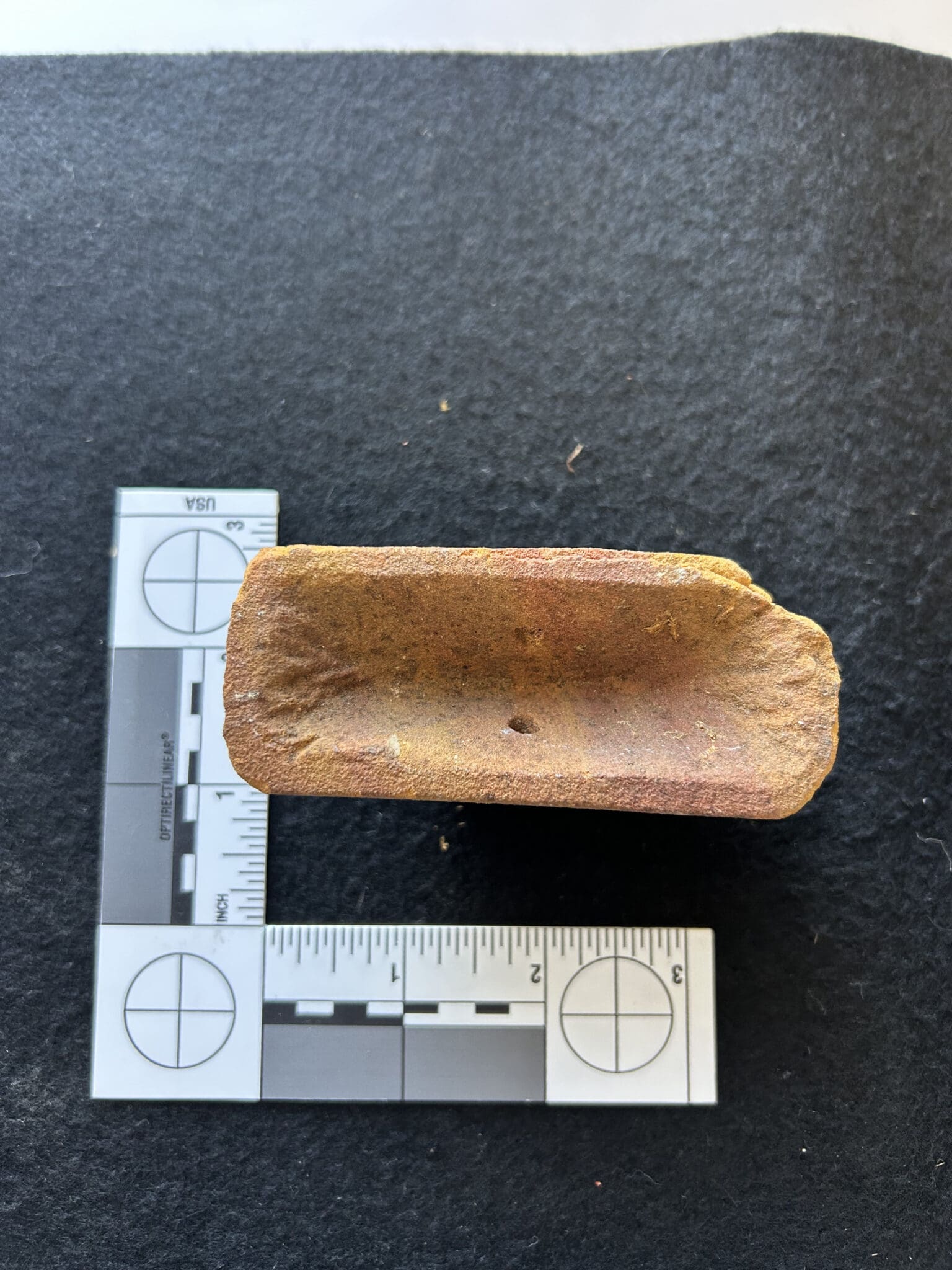 Vintage fired clay ceramic fragment with drilled hole, likely from a brick or industrial refractory piece. This terracotta fragment shows uniform shaping and machine-made characteristics, not Native American origin.