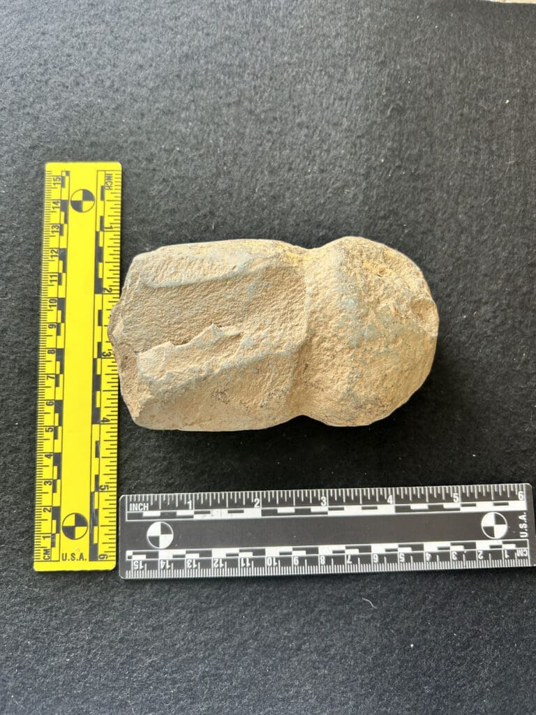 Native American grooved hammerstone or early-stage grooved axe, showing a pecked waist for hafting and heavy use-wear on both ends.